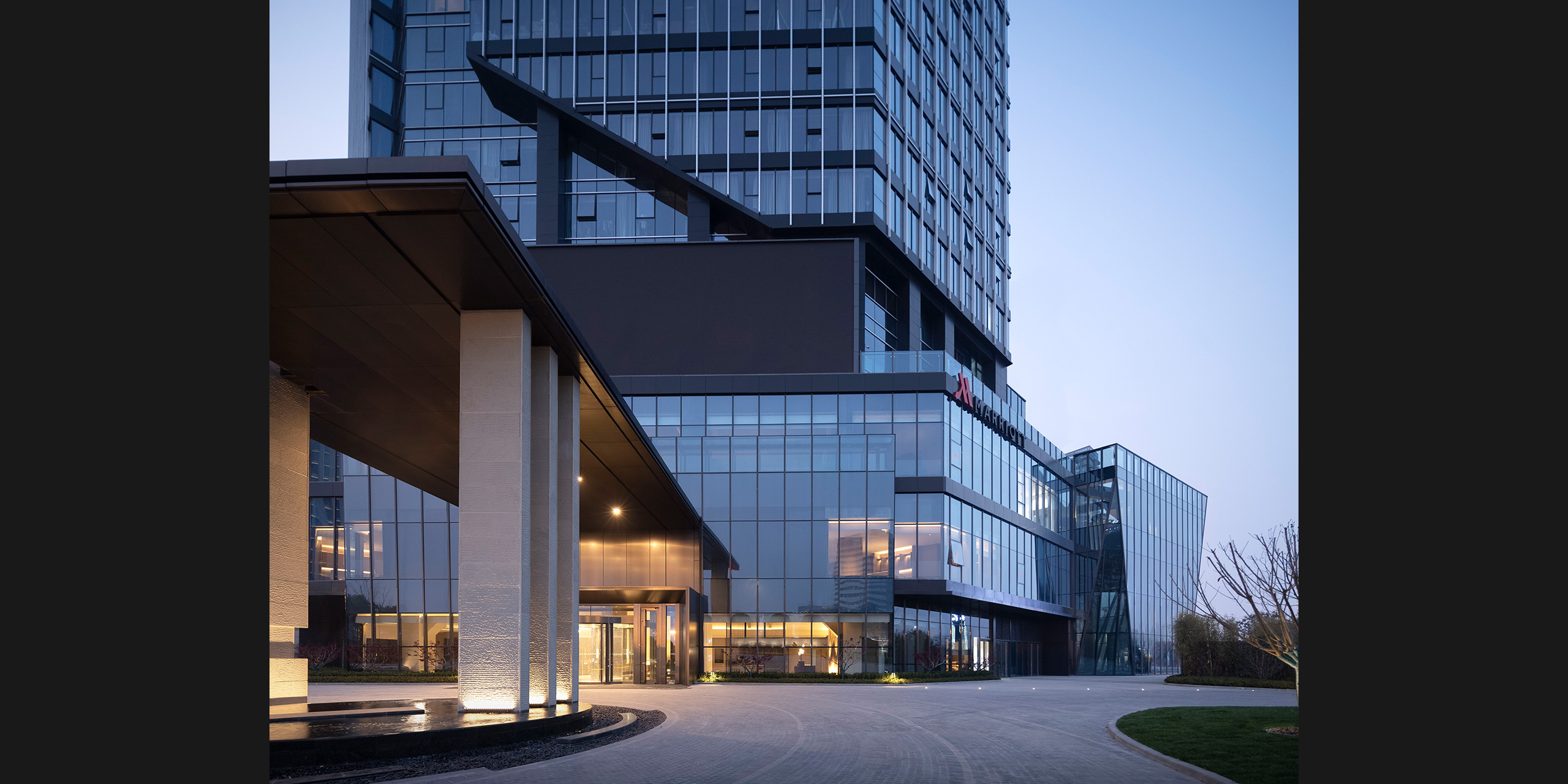 溧阳银江万豪酒店位于溧阳市南部燕山新区,东靠燕湖,西接燕山,南临溧阳高铁站,北通溧阳主城区,位于城市功能发展主轴和景观视线通廊的交叉口。在如此重要的区位条件下,项目被打造为溧阳的“三个一”:溧阳当下最高的超高层建筑;溧阳市第一家万豪酒店以及溧阳市第一家拥有千人宴会厅的婚庆综合体。