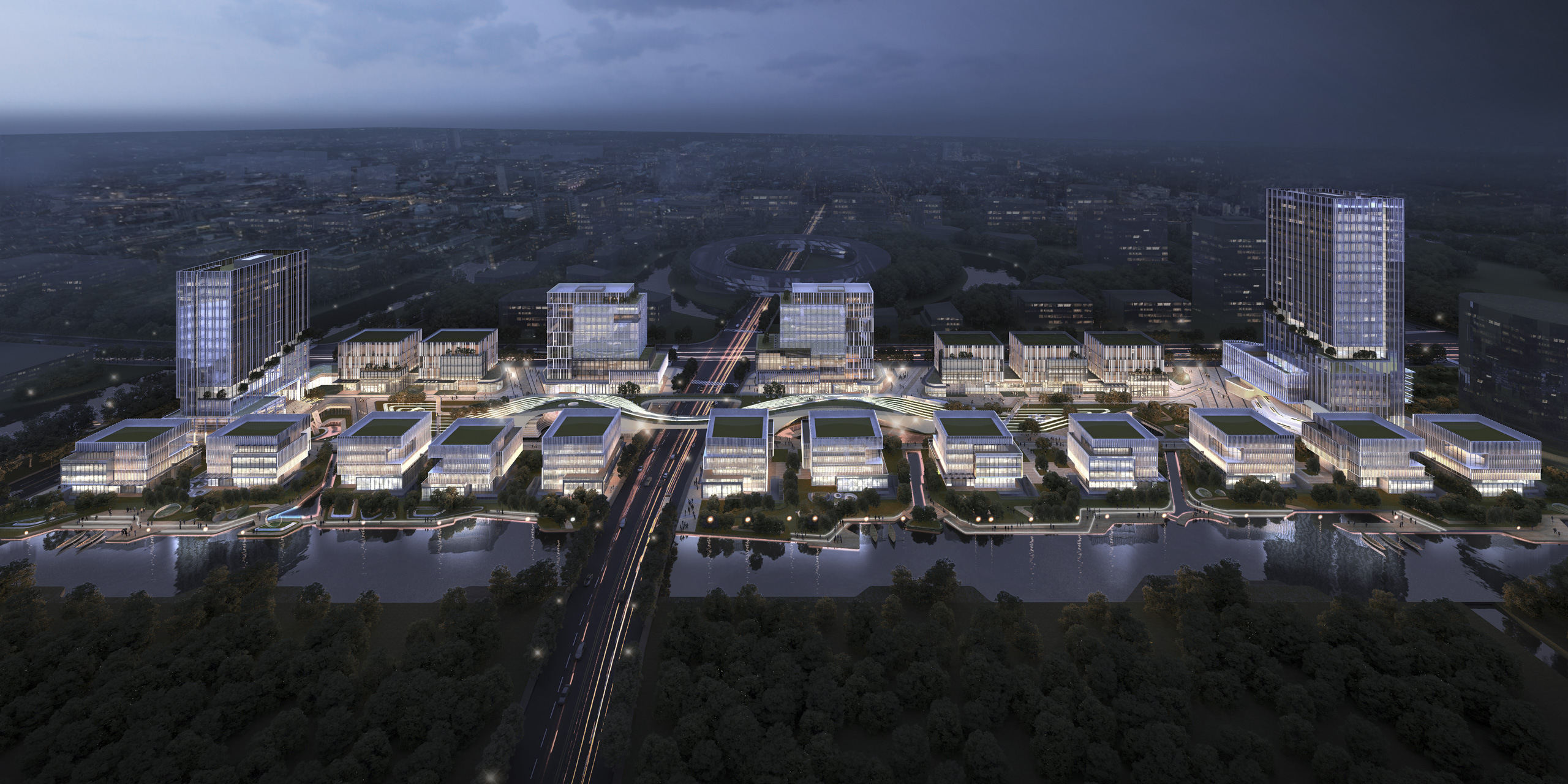 “连接”与“融合”是贯穿整个设计的核心概念。东西两个地块被长条形的中央地景式绿地廊桥贯穿,周围配置有一圈办公建筑。绿地廊桥的初衷本质上是为了消隐建筑的体量,在基地的中央区域起到“去建筑化”的效果。由于整个用地十分狭长,又分为东西两个地块,若按传统形式在用地内设置配套商业,会对产业园的整体性及办公环境产生较大的不利影响。这个矛盾在平面布局的设计上很难找到合适的解决方案,于是我们转向立体的设计手法,希望借助地景建筑的形式来消解掉这部分商业体量,通过连接两块地块间商业的屋面,在空间上创造一个更加完整的“第二地面”,作为园区的中央公园来打造。桥的底部对外以配套商业为主,对内部则设置了大量镂空的“趣味空间”,一方面给园区创造更多共享交流场所,另一方面作为缓冲地带,使商业以一种更有趣的形式融入园区的整体环境中。